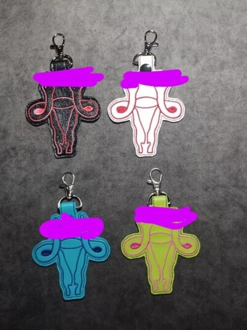 F Uterus Keychains embroidered on vinyl. If you want specific colors, please message me.